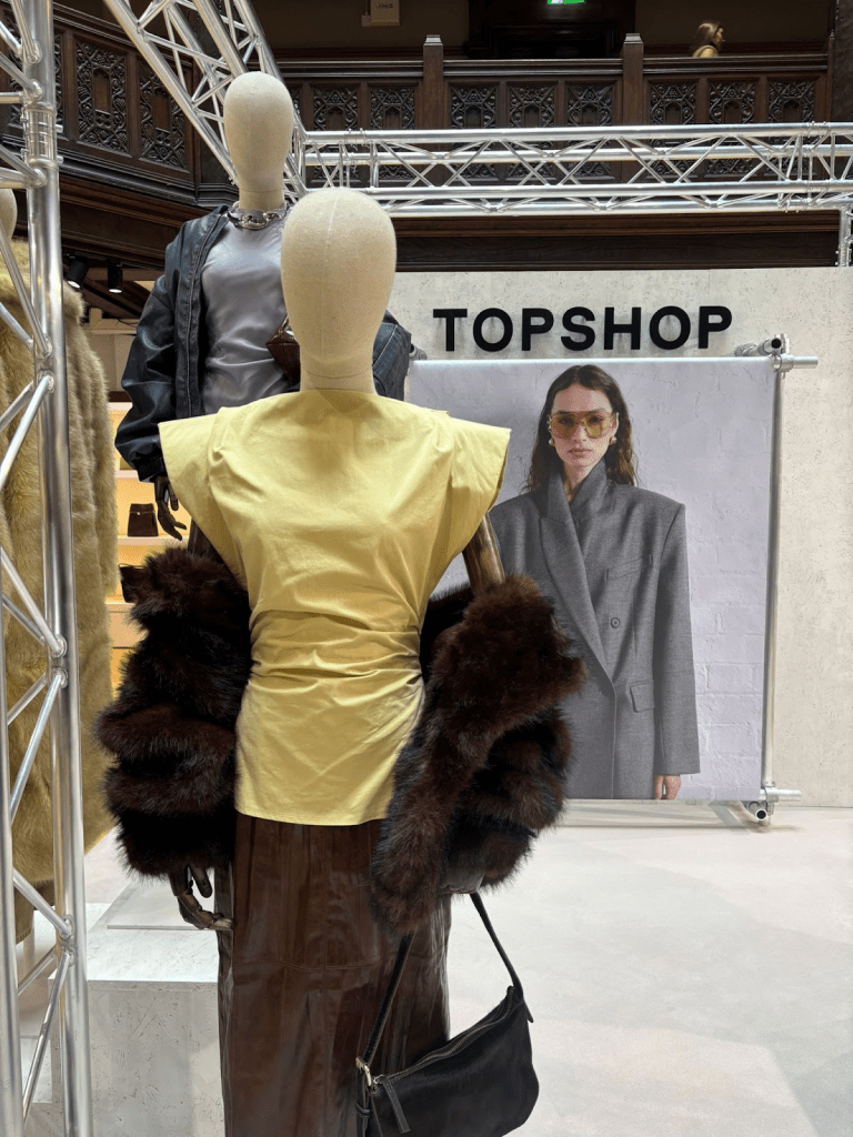 The collection itself was back on form. Topshop has never slavishly followed fashion trends like the Spanish and Swedish homogenised brands, dominating our high streets – not to mention the bland, beige, American try-hards. It has always represented the couldn’t-care-less attitude of the Brits. With a nod to vintage, it’s the spot where you can wear a full length fur coat, over a slinky bias cut dress. 80’s inspired jackets sit alongside mini dresses and skirts. A stand out patchwork PU jacket and Long brown PU mac wouldn’t be out of place on a 60’s Carnaby Street. A padded shoulder t-shirt top, fit for Joan Collins, sold out before my eyes. Then let’s talk about the knits – although a cocoon pleated, fashion jumper drew the eye, quietly sitting there was an everyday fitted cardigan, offered in brown, cream and grey with a premium detail of covered buttons. Their jeans collection could always stand on its own and it was interesting to see a belligerence in offering their iconic Joni high-rise skinny jean, when the whole world should have moved on – maybe they know something we don’t…? Fear not – they also stock the antithesis to The Joni – The Clutch, a low rise, baggy, tie-back jean. The only product that was really missing was their footwear collection which was inspiring the last time they were on the high street. Also, despite a splattering of handbags, these too were untouchable in both style and depth in the good old days.